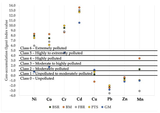 According to the Igeo classification, the total mean concentrations in all locations were extremely contaminated (Class 6) for Ni, Co, Cr, and Cd. Meanwhile, the total mean concentrations of Cu, Pb, Zn, and Mn were categorized as moderate contamination to unpolluted (Class 2–Class 0). For Ni, Co, and Cr, all sampling locations except GM were extremely contaminated (Figure 3). Igeo indices for Ni, Co, and Cr for the GM location were Class 1, Class 2, and Class 5, respectively (Figure 3).