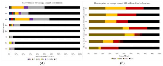 Percentage of heavy metals concentration in respective soil fractions (F1–F7) according to sampling sites. (A) BSR, (B) BM, (C) FBR, (D) GM. Detailed SSE calculations are in Supplementary Materials Table S3.