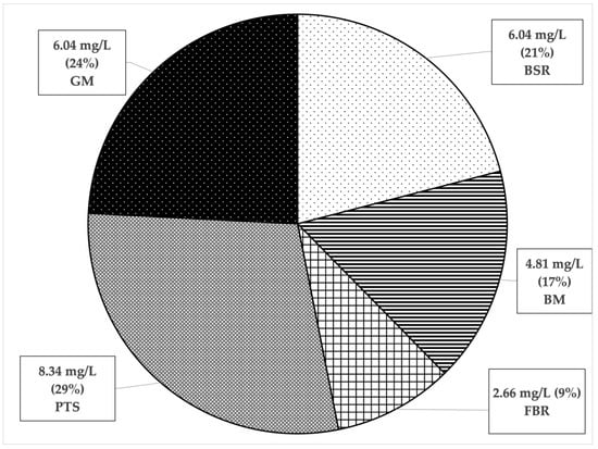 The toxicity concentrations in order from highest to lowest were Mn > Ni > Cu > Cr > Pb > Zn > Co > Cd. Mn had the highest total mean (4.10 mg/L), and Cd had the lowest total mean (1.42 mg/L). In terms of topsoil toxicity, the order from highest to lowest by location was PTS > GM > BSR > BM > FBR (Figure 6).