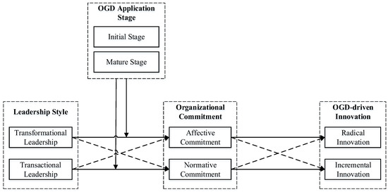 Furthermore, by introducing the OGD application stage, our study explores the stage-specific influence of leadership on organizational commitment and OGD-driven innovation. Previous research has shown the impact of leadership on different types of organizational commitment and innovation [63,75]. According to Avolio et al. [60], leaders are a combination of transformational and transactional leadership, and leadership behaviors are not fixed. Therefore, it is worthwhile to investigate if leadership shifts at different stages of OGD application, which has varied implications on organizational commitment and OGD-driven innovation. According to the findings of this study, transformational leadership triggers employees’ affective commitment in the initial stage of OGD application, resulting in OGD-driven radical innovation. Transactional leadership triggers employees’ normative commitment in the mature stage of OGD application, leading to OGD-driven incremental innovation.