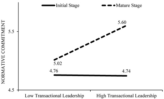 Moreover, Table 4 reveals that the interaction between transformational leadership and the OGD application stage was significantly associated with affective commitment (B = −0.53, p < 0.01). Table 5 reveals that the interaction between transactional leadership and the OGD application stage was significantly associated with normative commitment (B = 0.37, p < 0.05). To understand the nature of the interaction effects above, we performed a simple slope analysis for the initial and mature stages of OGD application. Figure 2 suggests that transformational leadership significantly influenced affective commitment in the initial stage of OGD application (slope = 0.45, t = 6.06, p < 0.01). However, it failed to significantly influence affective commitment in the mature stage of OGD application (slope = −0.08, t = −0.46, p = 0.65). Figure 3 suggests that transactional leadership significantly influenced normative commitment in the mature stage of OGD application (slope = 0.36, t = 3.33, p < 0.01). However, it failed to significantly influence normative commitment in the initial stage of OGD application (slope = −0.01, t = −0.08, p = 0.94). Hence, the results supported Hypotheses 7 and 9.