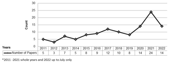 The temporal trends of selected scholarly articles show an increasing attention to GI applications very recently (2020 onward). Only 4% of the scholarly articles found using the article search were published in the beginning of the decade (2011–2012). Interestingly however, at the time of data analysis in only the first six months of 2022, already 14 studies matching our search criteria were published, accounting for 12% of the total selected papers. This trend of increasing number of published research papers demonstrates a positive attention to GI applications worldwide (Figure 1).