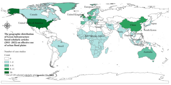 This review was carried out following a systematic literature review methodology to comprehend the intended objectives outlined in the introduction. This particular methodology was selected because it enables literature analysis in a systematic, transparent, and reproducible manner [33]. The methodology mainly consisted of the following five steps: (i) definition of the review objectives, (ii) selection of relevant research articles, (iii) evaluation of the selected articles, (iv) compilation of the collected data in a database, and (v) interpretation of the findings [33,34,35]. Accordingly, (i) the review objectives (as outlined in the introduction) were framed following a brainstorming session conducted by us. (ii) Springer Link, Taylor and Francis Online, Science Direct, Wiley Online Library, and Environmental Review bibliographic databases were utilized for article search. The search was limited to scholarly articles published in ISI indexed scholarly journals over the past decade (2011–2022). The Boolean operation was (“Green Infrastructure” AND “Urban Flood Plain Management”). The subject scope was mainly environmental sciences and related fields. The initially filtered scholarly articles were independently screened by us. Finally, only the articles (a) directly related to the review objectives and (b) case studies on the approaches of GI were selected for the review. (iii) selected scholarly articles (n = 120) were reviewed using a defined protocol to (iv) summarize the collected data in a Microsoft Excel database regarding (a) GI approaches in different regions worldwide, (b) diversity of GI typologies and, (c) analysis of strengths, weaknesses, opportunities, and threats (SWOT analysis) of GI applications. The (v) trends and possibilities for applying GI for effective use of urban flood plains were interpreted using the evidence gained by the analysis of the review findings.