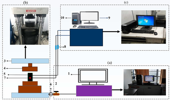 Overview of the experimental system diagram for natural and saturated coal: (a) loading control system includes (1) system for loading control, and (2) valve; (b) AE and EMR signals collecting and loading system consists of (3) servo hydraulic press, (4) press head, (5) coal sample, (6) pressure gauge, (7) AE Sensor, and (8) amplifiers; (c) AE data processing and storage system comprises (9) system screen to display data, and (10) AE monitor device.