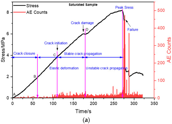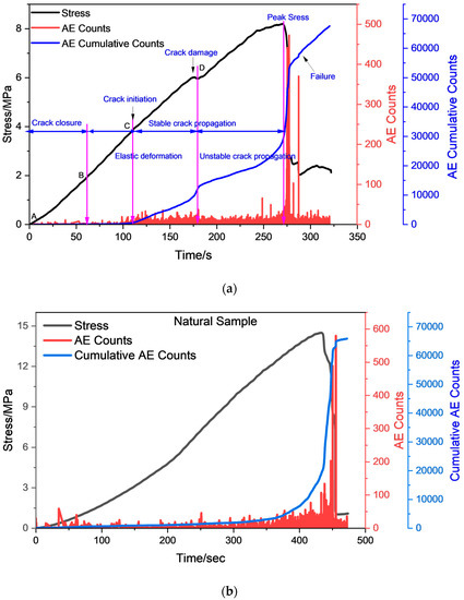 As shown in Figure 3a, the cumulative AE counts curve follows the stress/strain curve, so the AE approach can capture all phases of crack development. It has been noted that little, or no AE activity has been recorded in the stage called crack closure (A–B), due to the fact that existing micro- and macro-cracks are being closed. In response to an increase in uniaxial load, elastic deformation begins to occur (segment B–C), which is reflected in the increase in AE counts. The AE count increases linearly as the crack propagates toward point C, and the crack enters the stable propagation stage. An increase in the slope of the curve (C–D) indicates an increase in the strain energy released from the coal sample (i.e., more AE counts). The curve begins to deviate from a straight line at this point and cracks begin to develop until the specimen collapses (point F). A phase from D to E (D–E) prior to point F is referred to as an unstable crack propagation stage. [7,27,70].
