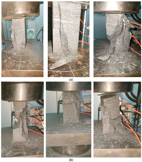 As shown in Figure 2, AE counts can be observed throughout the uniaxial test, but at the peak of the stress level, AE counts are at their highest levels. As soon as load progresses, “Crack closures and friction along fracture planes appear on the stress–strain curves at lower loading levels and crack propagation, penetration, friction, and slip appear at higher loading levels” [67,68,69].