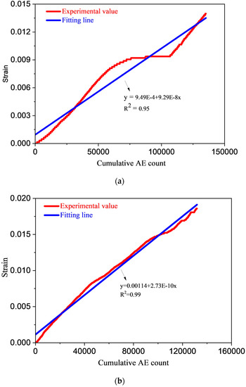 The varying trend of the cumulative AE count (CAEC) with strain under coal uniaxial loading is depicted in Figure 5; CAEC and strain exhibit a linear relationship induced by uniaxial loading in coal.