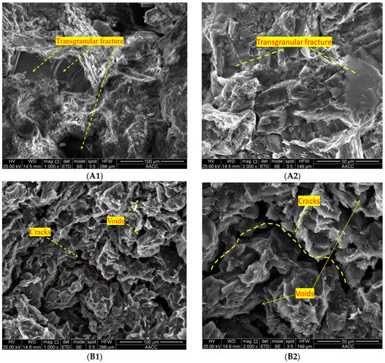 Transgranular fracture is simpler to spot in natural samples, as demonstrated in Figure 8(A1,A2). (In Figure 8(A1,A2), the area is flatter and smoother). Transgranular fracture becomes less prevalent as the water content rises. The voids and crack are more dominant in saturated coal. Water-eroded cracks can also be found in water-saturated materials. As a result, the coal’s strength is reduced, deformation rises, and energy is squandered. The deterioration of coals due to water action and the uneven distribution of water within rocks can result in the creation of weak planes that are prone to crack propagation during loading on a mesoscopic level [78]. As a result, high-water-content coals have more intricate failure patterns. This mechanism is also influenced by pore water pressure.
