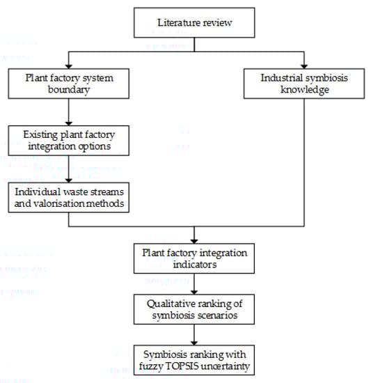 The methodology illustrated in Figure 1 shows how the industrial symbiosis assessment method was developed in this paper, using the existing knowledge of plant factories, industrial symbiosis and decision-making methods. Figure 3 illustrates the procedure for using the developed industrial symbiosis assessment method to evaluate plant factory industrial symbiosis scenarios.