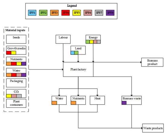 Adapted system boundary which highlights input and output streams from a typical plant factory.