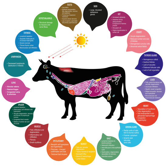 Due to the paucity of information specific to livestock, the descriptions in this review are organized according to the limited data available. They are also compared with studies in other species. This review evaluates the changes in the histology of various organs, as it is critical to enhancing our understanding of heat load-induced pathologies in major livestock production species.