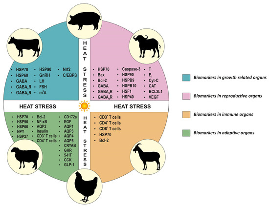 Heat stress also results in hypofunction of the thyroid gland and affects the metabolism patterns of the animal to reduce metabolic heat production [13]. Heat stress affects cellular functions and causes impairments of the reproductive system in both sexes. In males, it reduces spermatogenic activity, while in females, it adversely impacts oogenesis, oocyte maturation, fertilization development and implantation rate [14]. Therefore, the detrimental effect of heat stress on various productive and adaptive organs negatively impacts their performance, resulting in reduced global livestock production.