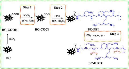 2.2.2. Preparation of Hyperbranched DTC-Modification Biochar (BC-HDTC)