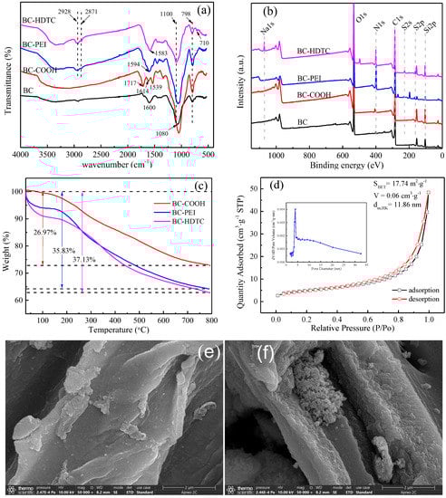 FT-IR spectra (a) and XPS wide-scan spectra (b) of biochar, TGA results (c) of BC-COOH, BC-PEI and BC-HDTC, N2 adsorption-desorption isotherms (d) and pore size distribution (inset) of BC-HDTC, SEM of BC-PEI (e) and BC-HDTC (f).