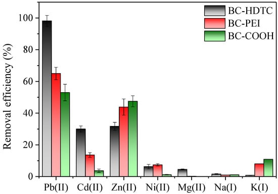 In order to verify that the modification is greatly improved the selectivity and adsorption capacity to Pb(II), metal ions solution contain 100 mg·L−1 Pb(II), Cd(II), Zn(II), Ni(II), Mg(II), Na(I), K(I) was used to probe the adsorptivity of BC-HDTC, BC-PEI and BC-COOH at pH = 5. The results show in Figure 3, the removal rate of BC-PEI, BC-COOH toward Pb(II) were 65% and 53%, respectively, while Cd(II), Zn(II) were less than 30% and 10% for Ni(II), Mg(II), Na(I), K(I). In sharp contrast, BC-HDTC showed a high affinity towards Pb(II) and its removal rate up to 98% but less than 35% for Cd(II), Zn(II) and 10% for Ni(II), Mg(II), Na(I), K(I). This shows that the modification increased the BC-HDTC affinity for Pb(II). According to HSAB theory, amine/imine and dithiocarbamate groups are defined as soft bases but Ni(II), Mg(II), Na(I), K(I) ions belongs to hard acids, resulting in low removal rate. From this result, it is distinct that hyperbranched dithiocarbamate modified biochar is conducive to improving the affinity for Pb(II) in wastewater.
