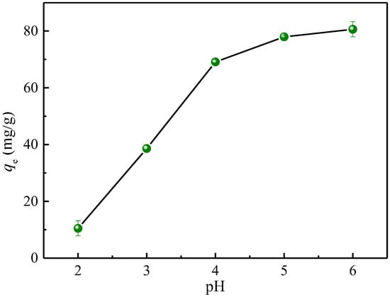 Using a 100 mg·L−1 Pb(II) solution at predefined pH values among 2 and 6, the batch technique was used to examine the effect of pH on the BC-a HDTC’s dsorption capability [41]. Figure 4 shows that, the uptake of Pb(II) was remarkably affected by the solution pH and the adsorbed quantity obviously increased to 80.6 mg·g−1 with the increasing pH from 2 to 6. At low pH, the available active sites of BC-HDTC decreased due to the protonated functional groups (amine/imine and dithiocarbamate groups)and were occupied with excess protons instead of Pb(II), leading to a low absorption performance [34]. Additionally, at pH = 3, the dithiocarbamate groups readily went down into amine and carbon disulfide, which inhibited BC- HDTC’s for capacity adsorption [21]. With increased pH from 2 to 5, a greater number of deprotonated functional groups and a minimal protons level to compete with Pb(II) for vacant active sites, considerably enhancing Pb(II) adsorption efficiency. The influence of the metal hydroxide precipitation was therefore reduced by conducting additional adsorption experiments at pH = 5.