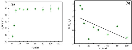The influence of contact time on the adsorption of BC-HDTC in a medium containing 100 mg·L−1 Pb(II) at pH = 5 and 30 °C is illustrated in Figure 5a. As shown in Figure 5a, the adsorption capacity increased rapidly in the first 20 min. This is due to the adequate unoccupied adsorptive sites existence with the capacity of Pb(II) adsorption as soon as they come into contact. The adsorption attained equilibrium after about 120 min due to the declining active sites and repulsive forces between absorbed and unabsorbed Pb(II) [34].