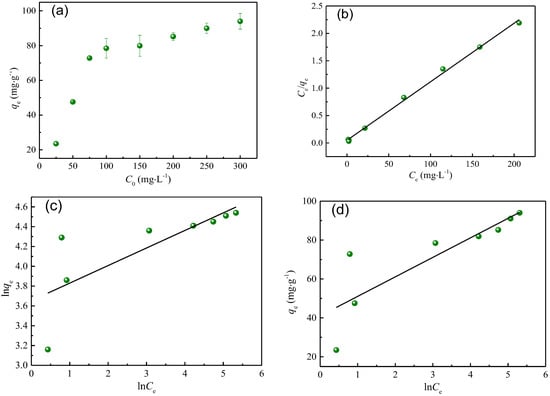 The understanding of adsorption isotherms is important for implementing adsorption systems effectively [42]. Here, the Langmuir (Equation (6)), Freundlich (Equation (7)) and Temkin (Equation (8)) models were used for fitting the adsorption isotherm data.