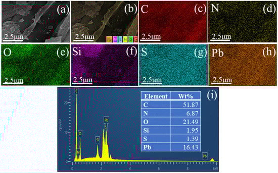 A critical characteristic of the study of adsorption performance is the research of the adsorption mechanism. The SEM and EDS images clearly highlight the Pb(II) adsorption behavior on the BC-HDTC surface. Figure 7a–g shows the BC–HDTC–Pb(II)’s composition and confirms the presence of the key components C, N, O, Si, and S in the adsorbent. As shown in Figure 7h, the surface of BC-HDTC-Pb was uniformly displayed Pb, indicating that Pb(II) was successfully adsorbed. Furthermore, the occurrence of the aforementioned components was also verified in the EDS spectrum (Figure 7i), further validating the integration of Pb(II) and BC-HDTC.