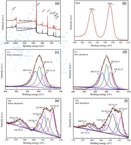 Figure 8c,d, respectively, demonstrate the high-resolution N 1s bands of BC-HDTC both before and after the absorption of Pb(II). Prior to adsorption, -NH2, -NH, and N-CS2 bonding, respectively, were allocated to the binding energy peaks at 399.14, 399.85, and 400.58 eV [21]. After binding to Pb(II), the binding energy of N shifted obviously to higher binding energy (399.26, 399.99 and 400.76 eV) in Figure 8d. The chelating formation between Pb(II) and the N atom of DTC group resulted in transferring of electrons from N atom of DTC group to Pb(II), decreasing of electron density and the increasing of binding energy of nitrogen atoms [34]. Further, the high-resolution S 2p spectra of BC-HDTC before Pb(II) adsorption (Figure 8e) exhibited six peaks containing binding energies of 161.82, 162.86, 163.69, 164.64, 168.38, and 169.42 eV, which correspond to the C=S (S 2p3/2), C-S (S 2p3/2), C-S (S 2p1/2), SOn− (S 2p3/2) and SOn− (S 2p1/2) [44,45]. These signals of S migrated to 161.72, 162.54, 163.46, 164.61, 167.75 and 168.91 eV after adsorption respectively, indicating sulfonate and DTC participate in the Pb(II) adsorption process (Figure 8f).