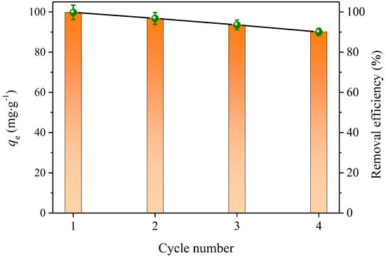 A good adsorbent should not only have high adsorption capacity, but also its regeneration ability deserves special attention [46]. In addition, rapid desorption is also a key factor for the wide application of materials [47]. An excellent desorption solution comprised of 0.5 M NaOH and 1.5 wt% EDTA is employed to assess the material’s regeneration capacity within a short period of time. The qe, and removal rate values in different adsorption-desorption cycles were shown in Figure 9. After four adsorption-desorption rounds, the adsorption rate was greater than 90%, though the recycling capacity somewhat decreased. This is possible because there were limited power binding sites, which indicate that BC-HDTC, with its high stability and excellent recyclability, could be a potential adsorbent for removing Pb(II) from wastewater.