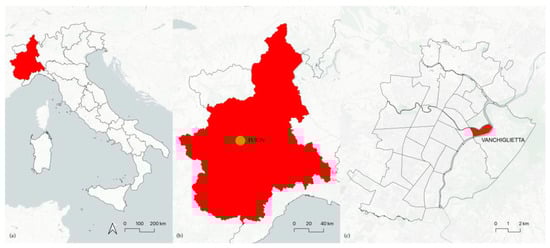 Case study localization. Piedmont Region in (a), Turin city in (b), Vanchietta district in (c).