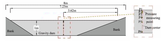 In the experiment, the instantaneous water level in the flume was measured by an ultrasonic wave-measuring instrument, and the acquisition frequency was 150 Hz. A wave pressure acquisition system was used to measure the dynamic wave pressure on the dam surface, and the acquisition frequency was 300 Hz. A total of 22 groups of wave gauges were set up in the flume to record water level changes, numbered G1–G22 (Figure 1b). Six groups of embedded pressure sensors P1–P6 were used to record the dynamic wave pressure at different heights of the dam center. The pressure sensor’s position in the dam is shown in Figure 2, and the specific dimensions are shown in Table 3. This paper focuses on the vertical pressure at the dam’s center and the wave height propagation from the landslide point to the dam center. The wave gauge corresponds to G2–G5.