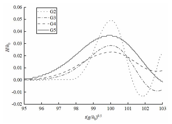To explore the evolution characteristics of impulse waves near the dam area, we analyzed the typical wave surface duration curve from the landslide point to the dam center line under a static water depth of 0.95 m (Figure 3). The results of the G2−G5 wave gauges show the wave surface duration curves under working condition M8. The ordinate is the dimensionless water depth H/h0 and H is the instantaneous water level measured by the wave meter minus the still water depth. The abscissa is the dimensionless wave propagation time t(g/h0)0.5, and g is the gravity acceleration (maximum value of the first peak adjusted to the same abscissa position). According to the previous wave classification [19], we found that the waves generated by the swell gradually changed from nonlinear waves to linear waves near the dam. The initial wave height before the landslide point was the largest, and the peak was steep. The first peak of each wave train gradually decreased along the ray direction (G2−G4), and the peak flattened when the surge propagated to the front of the dam (G5). Due to the blocking effect of the dam surface, a large surge was often generated with a wave peak larger than the previous ones and smaller than the initial.