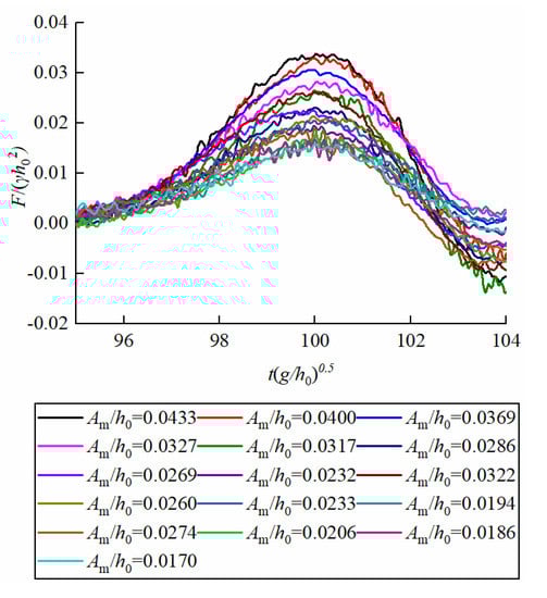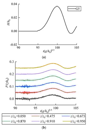 The pressure P of the impulse wave action on the dam surface is defined as the difference between the total pressure and the initial hydrostatic pressure. In M8, the instantaneous variation of the wave pressure on the central section of the dam under the action of the front head wave (G5) is shown in Figure 4. The dimensionless wave pressure P/γh0 and the dimensionless water depth H/h0 are a function curve relative to the dimensionless time t(g/h0)0.5. We smoothed the wave height G5 curve with a Fourier filter for better visual results, and the wave pressure duration curve relative to the previous curve increased by 0.05. The wave pressure curve was consistent with the water surface process line, with a positive correlation.