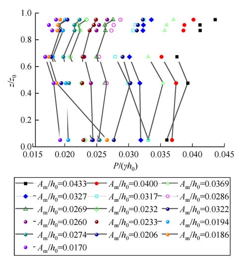 In the landslide-generated impulse wave test, the maximum amplitude of the dimensionless first wave (Am/h0) changed between 0.017 and 0.043. The test results show that the first wave amplitude increased with landslide angle when the landslide volume was constant. When the landslide angle was constant, the first wave amplitude increased with landslide volume. When the landslide volume and angle were constant, the first wave amplitude increased with landslide width. The first wave amplitude was greatly affected by the slope angle and volume. Under these dimensionless first wave amplitudes, the maximum wave pressure P/γh0 at different heights z/z0 on the dam surface is shown in Figure 5. It is noteworthy that the minimum wave pressure was near two-thirds of the water depth (z/z0 = 0.673). The maximum wave pressure generally appeared on the still water surface and occasionally at the bottom, especially when the landslide volume was small. Since the bottom is affected by other signals, a high-frequency interference signal is prone to occur. The interference signal has not been eliminated after filtering, but its average value is slightly smaller than the hydrostatic wave pressure. Overall, the wave pressure in the water depth direction increased first, then decreased, and then increased. The decrease rate was faster than the increase rate.