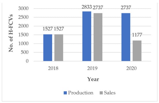 The production and sales results of H-FCV in China from 2018 to 2020. Data collected from China Association of Automobile Manufactures [,,,].