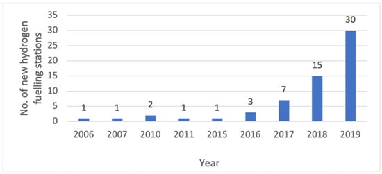 The number of new hydrogen fuelling stations from 2006 to 2019 (adapted from Ref. []).