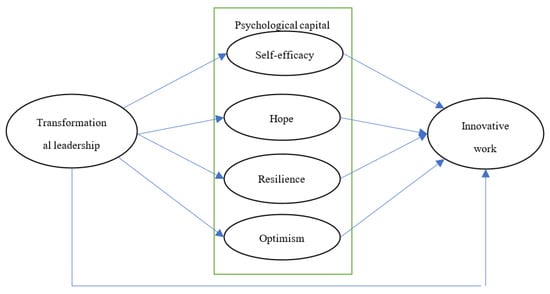 Researchers suggest that transformational leaders have the potential to improve their followers’ innovation via various mediating mechanisms and variables. Psychological capital is among these mediating variables that have been emphasized in the literature [15]. Many scholars argue that employees’ positive psychological states help them to become more innovative and creative in the workplace [16,17,18]. Moreover, Luthans [19] accentuates the exploration and explanation of the potential antecedents and mediating roles of psychological capital in organizational behavior constructs. The theoretical justification for the choice of this mechanism is as follows. A transformational leader as a powerful contextual resource is expected to build a broad follower-based psychological resource in the pursuance of setting goals and accomplishing them, overcoming obstacles, and believing in a brighter future, as represented by psychological capital [20], which in turn motivates followers to become more creative and innovative to fulfill their duties.