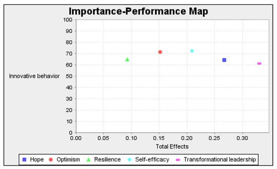 This study extends the research model analysis by performing an importance-performance map analysis (IPMA) in SmartPLS to prioritize the antecedent factors of employees’ innovative work behavior. The IPMA is comprised of the measurements of total effects (i.e., importance) and index values (i.e., performance), which allows a better conclusion to be drawn so that researchers may help managers prioritize their actions [103,106].
