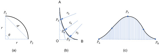 Schematic diagram of each type of curve fitting algorithm. (a) Single-circular-arc discretization; (b) multiple-circular-arc discretization; (c) Spline curve discretization.