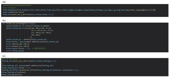 Figure 3a shows the adjustment process of key parameters and related codes in the development environment. The adjustment of four key parameters, namely shoulder width, bust, sleeve length, and garment length, can acquire the basic shape of the shirt–body pattern (collar not included). Figure 3b shows the process of adjusting the sleeve width, a secondary parameter involved in the sleeve pattern and based on the key parameter of sleeve length. Figure 3c shows the process of adjusting the line of the waist area in the body pattern from a straight line to a curve, which also reflects the process of adjusting the variable parameters.