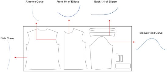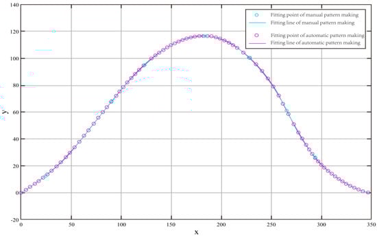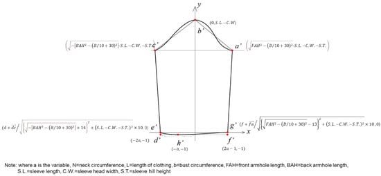 By using the pattern decomposition and fitting methods in Section 2.1 and Section 2.2, a parametric coordinate system was established; Figure 4 shows the parameterized coordinate system of the sleeve pattern in the established coordinate system (the full data of the coordinate system is shown in the Supplementary document). Since the point coordinates, fitting algorithm, and body data in the coordinate system were all parametric variables, it is possible to obtain garment patterns of different body data and styles by modifying the variables in the system.