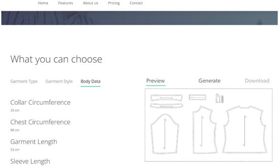 The front-end interface was designed and developed using the Vue framework and presented as a web or applet, as shown in Figure 7. In the front-end interface, dimensions such as collar circumference, bust circumference, waist circumference, garment length, sleeve length, and sleeve head width can be entered, and a certain style of garment can be selected. The automatically generated patterns were saved in the DXF file format, which was available for downloading or sent to the production side.