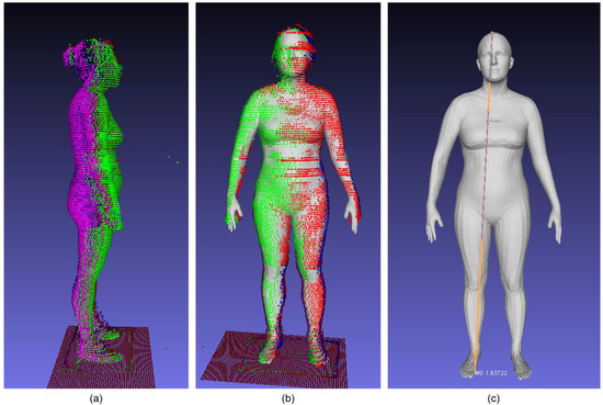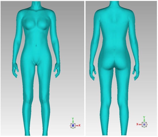 A total of 53 healthy female participated in the experiment. Their (M ± SD, mean and standard deviation) age, height, and weight were 27.6 ± 6.8 years, 165.0 ± 10.4 cm and 55.2 ± 11.0 kg, respectively. Before the experiment, all the participants were informed about the details of the experiment beforehand and their body data were measured using three-dimensional body scanning equipment (BOK, Body 3D Scanner II, China) with an accuracy of ±0.5 mm. Information on parameters such as chest circumference, collar circumference, waist circumference, and height were extracted from the participant’s three-dimensional model, as detailed in Table S1 in the Supplementary document. Figure 8 shows the processing of a three-dimensional mannequin of a particular participant.