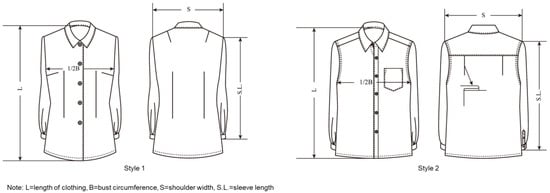 Group A: A total of 53 participants’ body parameter data were input in the above system, and two different styles of women’s shirt patterns were generated according to each group of data. These two different patterns of women’s shirts are shown in Figure 9. Their specific specifications are detailed in the Supplementary document.