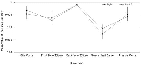 After the comparison, the average of the test values for the comparison of similarity between the pattern pictures of group A and group B is shown in Figure 12. The worst mean similarity among all the data was the sleeve head curve of style one with a test value of 0.9873, because the complexity of the sleeve head curve is higher than the other curves, and more parameters need to be substituted in the fit.