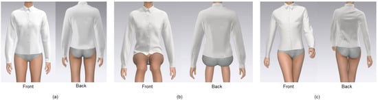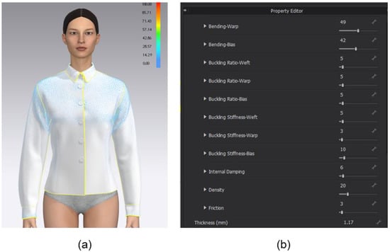 The created solid model of the human body and the automatically generated patterns were imported into the CLO 3D software, and three different groups of fabric properties were set in the software, i.e., 100% cotton, 100% polyester, and 50% cotton + 50% polyester, with the specific index parameters shown in Table 2. The test diagram is shown in Figure 14a.