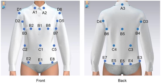At the same time, the pressure parameter values of the collar, bust, waist area, and sleeve hole areas of the virtual model were extracted in CLO 3D according to the female body structure and the key areas that affect the fit of the garment, as shown in Figure 15.