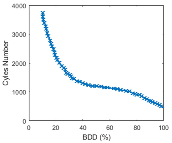 Relationship between the charging/discharging cycles and the battery degradation depths (BDDs) during their life span [25].