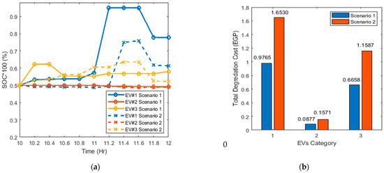 A detailed schematic for the EV SOC levels after every 6 min is expressed in Figure 6a. Almost all the EVs reached a capacity of more than 60% for both scenarios while minimizing the degradation cost and maximizing the profit. The battery degradation cost was investigated for each EV category, as shown in Figure 6b. The degradation cost decreased by 11.18%, 20.29% and 15.42% for EV Categories 1, 2, and 3, respectively. However, the revenue for each EV category owner in Scenario 2 was higher than in Scenario 1, as shown in Figure 6c. The load demand of the utility grid was reduced to almost 16.7718% at 11:24 and remained equal to the calculated average required power throughout the day, as shown in Figure 6d.