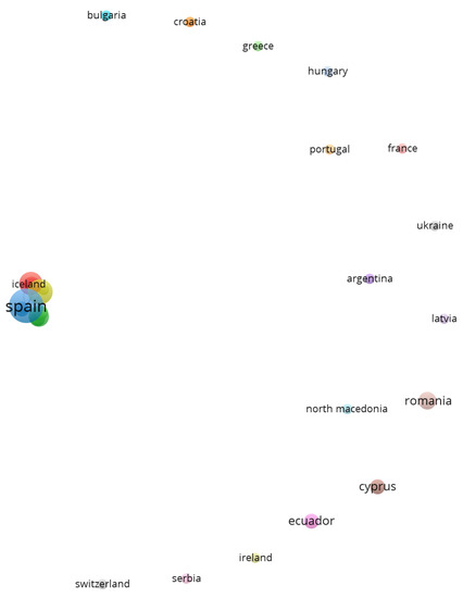 A literature search on the Web of Science Core Collection (WoS) online databases by using the search keyword EntreComp, was performed in June 2022 to identify scientific contributions on EntreComp. There were no restrictions regarding the study period, document type, or language. Retrieved articles were from period 2016–2022, and for each of them retrieved data contained the following information: title, abstract, years of publication, authors, authors’ affiliations, sources, and citations. The bibliometric analysis was performed by using VOSviewer software (VanEck and Waltman, Center for Science and Technology Studies of Leiden University [9,10]), a tool that has been used in studies from various areas of research [11,12,13,14,15,16,17,18,19,20,21]. The countries of origin and documents’ citation network are used to represent the between-countries and interorganizational collaboration, and keyword cooccurrence analysis was used to identify relationships between document topics. In the network visualization map, the link and the distance between two countries/publications/terms demonstrated the relationship strength (the smaller the distance, the most strongly related to each other). Countries/documents/terms are grouped in clusters of closely related items, the color of the bubble indicating the cluster in which the countries/documents/terms belonged to.