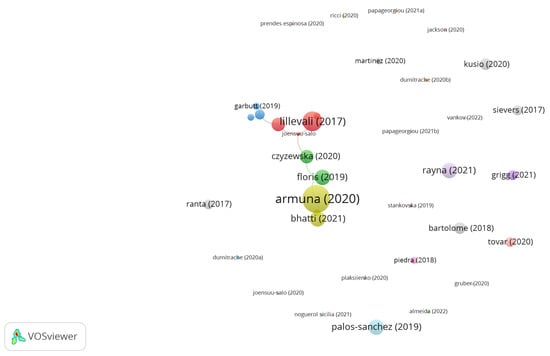 The articles with five or more citations were by Armuna et al. (2020, International Entrepreneurship and Management Journal, impact factor (IF) 6.15) [22] with 16 citations, Lillevali et al. (2017, Education Research International) [23] with 16 citations, Floris et al. (2019, International Journal of Educational Management) [24] with five citations, Bhatti et al. (2021, Journal of Small Business and Enterprise Development) [25] with five citations, Rayna et al. (2021, Technological Forecasting and Social Change, IF 10.88) [26] with five citations, and Palos Sanchez et al. (2019, Interciencia, IF 0.39) [27] with five citations (Figure 6).
