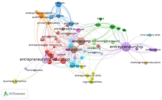 The network visualization of keywords on the publications was used to map topical directions in the field of EntreComp research. A total number of 193 keywords were identified from the research articles. The most frequently used keywords were entrepreneurship (13), entrepreneurship education (10), EntreComp/entrepreneurial/entrepreneurship competencie(s) (9/9), education/higher education/primary education (8/6/2), self-efficacy (5), innovation (4), enterprise/business/business dynamics (4/3/2), and gender/gender differences (3/2) (Figure 7). It can be seen that the researchers covered topics focusing on EntreComp competencies and entrepreneurship education (primary and higher) and/or enterprise/business dynamics/business takeover/business transfer. Moreover, within the figure there are clusters of keywords that are related to gender/gender differences, entrepreneurial intention, self-efficacy, attitudes, cognitive abilities, collaboration, and performance and innovation.