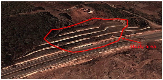 The study site is located on the right side of Yunda Road (when driving toward Wanxichong) in Chenggong District, Kunming (E102 51′ 47.27″ and N24 49′ 39.44″). The area is in the north subtropical zone with a low latitude plateau/monsoon climate. The average annual temperature is 14.7 ℃ and the average annual rainfall is 789.6 mm; 80% of the annual rainfall occurs in the period from April to October. The study site is an east–west, north-back shady slope, within which Slopes I, II and III have a slope rate of 1:1, while Slope IV has a slope rate of 1:1.2. The total length of the slope along the driving direction (toward Wanxichong) is about 260 m, and the slope height is about 40 m. Slope I is paved with mortar rubble (10 cm thick) with no retaining wall at its foot. Slopes II, III and IV are protected by mortar diamond grids and grass. The soil is dominated by silty clay, and the vegetation at the top of the slopes is mostly low shrubs, with a few trees and no heap loading. A work side three-dimensional terrain map and study area map are shown in Figure 1 and Figure 2, respectively.