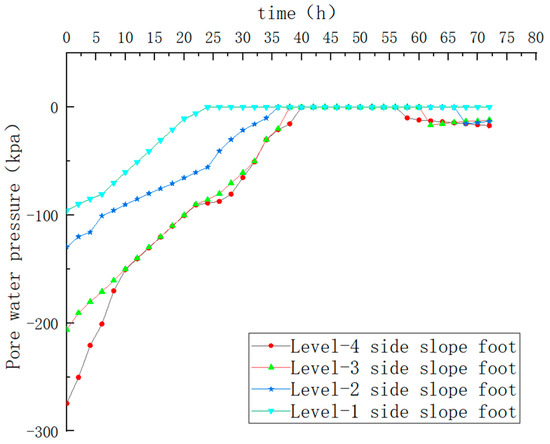 According to the situation of rainfall from 10–12 June 2015, Geo-studio software was applied for transient simulation analysis of slope pore water pressure, as shown in Figure 4. With the increase in rainfall duration, the pore water pressure in the unsaturated zone of the slope changes. In the process of rainfall lasting for 72 h, due to the influence of groundwater level, the pore water pressure at the foot of the slope, which is higher than the water level line, changes greatly due to the capillary water pressure in the slope. The pore water pressure changes little when the slope foot is close to the groundwater level. With the continuous development of rainfall infiltration, the water content of slope soil increases, especially the accumulated water at the foot of the slope is obviously more than that on the uphill slope, which reduces the absolute value of negative pore water pressure and dissipates matric suction. This results in the gradual decrease in effective stress and shear strength of the slope soil at the foot of the slope, thereby causing slope soil loosening and slipping at the foot of the slope, and extending to the upper Slope I, thus reducing the safety and stability of the whole slope.